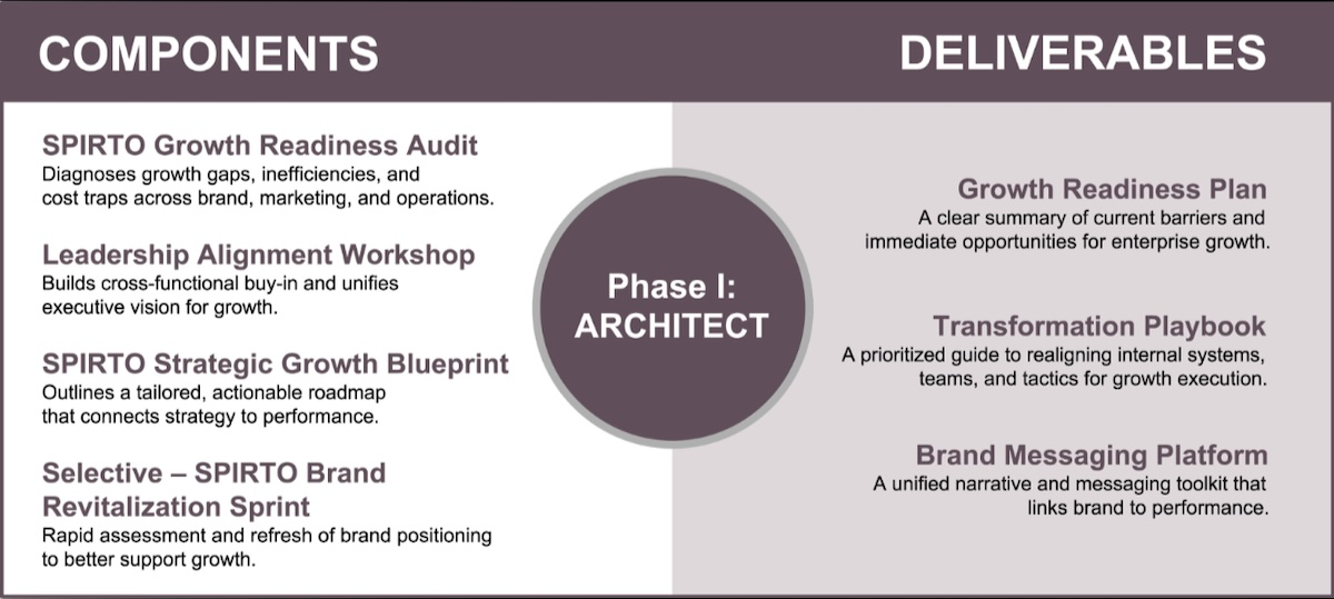 The Architect Phase of the SPIRTO Growth Lab prevents that drift. It’s the disciplined front-end where we diagnose reality, align leadership, and design the Strategic Growth Blueprint—a living roadmap that ties every decision to enterprise value.