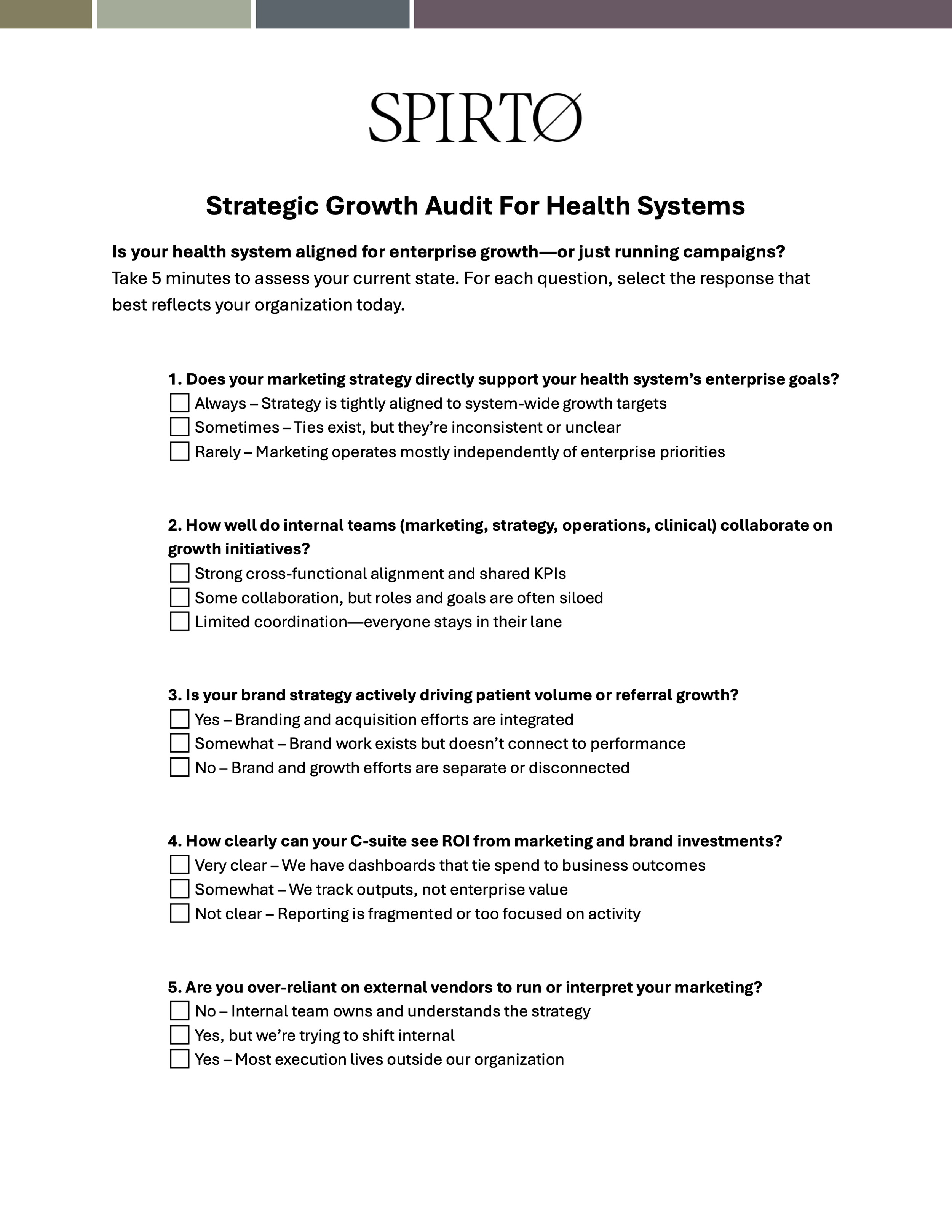 Are you optimizing patient volume and capacity utilization? The SPIRTO Strategic Growth Audit is a 10-question tool to diagnose your health system's growth engine. Find out if your biggest constraint is Clarity, Capacity, or Confidence.